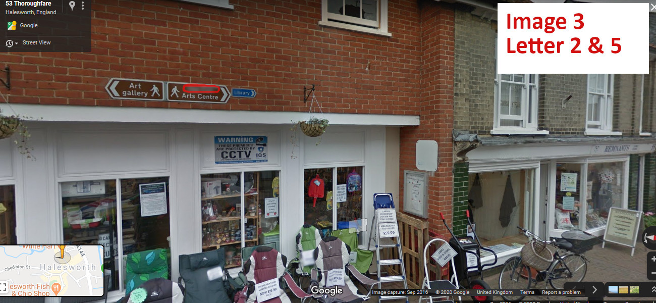 Find all the letters, then re-arrange to find where the "treasure" has been hidden. It will be somewhere in the same town visible on Street View/Google Maps.