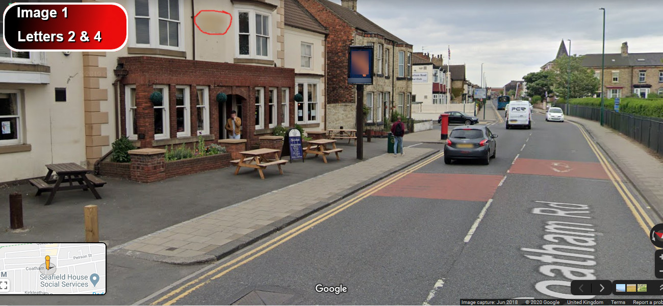 Find all the letters, then re-arrange to find where the "treasure" has been hidden. It will be somewhere in the same town visible on Street View/Google Maps.