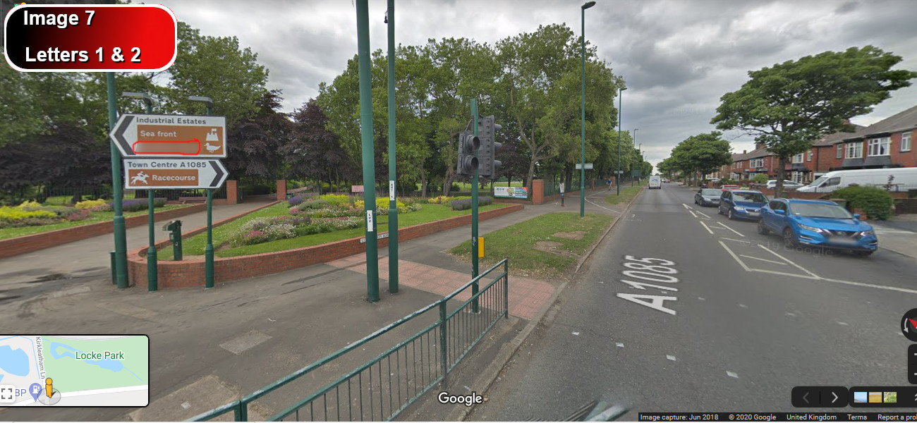 A sign or display has been deliberately blurred. This is roughly ringed in red. Just occasionally this is replaced with a pale blue outline if there is an existing red background.