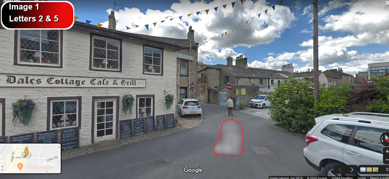Look to see if there is a landmark such as a church tower, a well known shop sign or logo of a bank which may help identify the location. In the bottom left there is a panel which might indicate a street name or a road number.